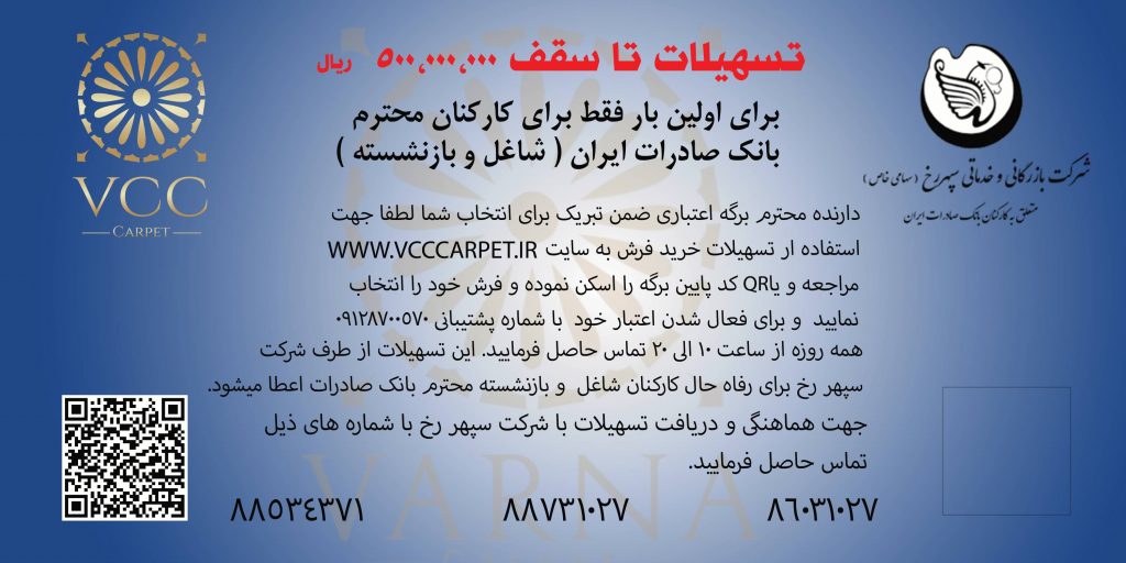لازم به ذکر است که این تخفیفات تنها شامل تولیدات این شرکت به نام وارنا کالتکس بوده و در صورت خرید از فرشهای کارخانههای قیطران و سپهر باید به صورت نقدی تسویه و یا به ازای هر ماه اقساط معادل ۲٪ به مبلغ کل فاکتور اضافه شود. این امکان طبق توافق شرکت فرش وارنا با شرکت سپهررخ جهت رفاه حال شما عزیزان فراهم شده است. لذا برای سهولت فرایند خرید فیلم آموزشی خرید را مشاهده و در صورت هرگونه سوال با پشتیبانی سایت تماس حاصل فرمایید. برای آگاهی بیشتر یا هرگونه سوال لطفاً با شماره پشتیبانی سایت ۰۹۱۲۸۷۰۰۵۷۰ تماس حاصل فرمایید. خوشحالیم که عضو جدیدی از خانواده بزرگ فرش وارنا هستید.