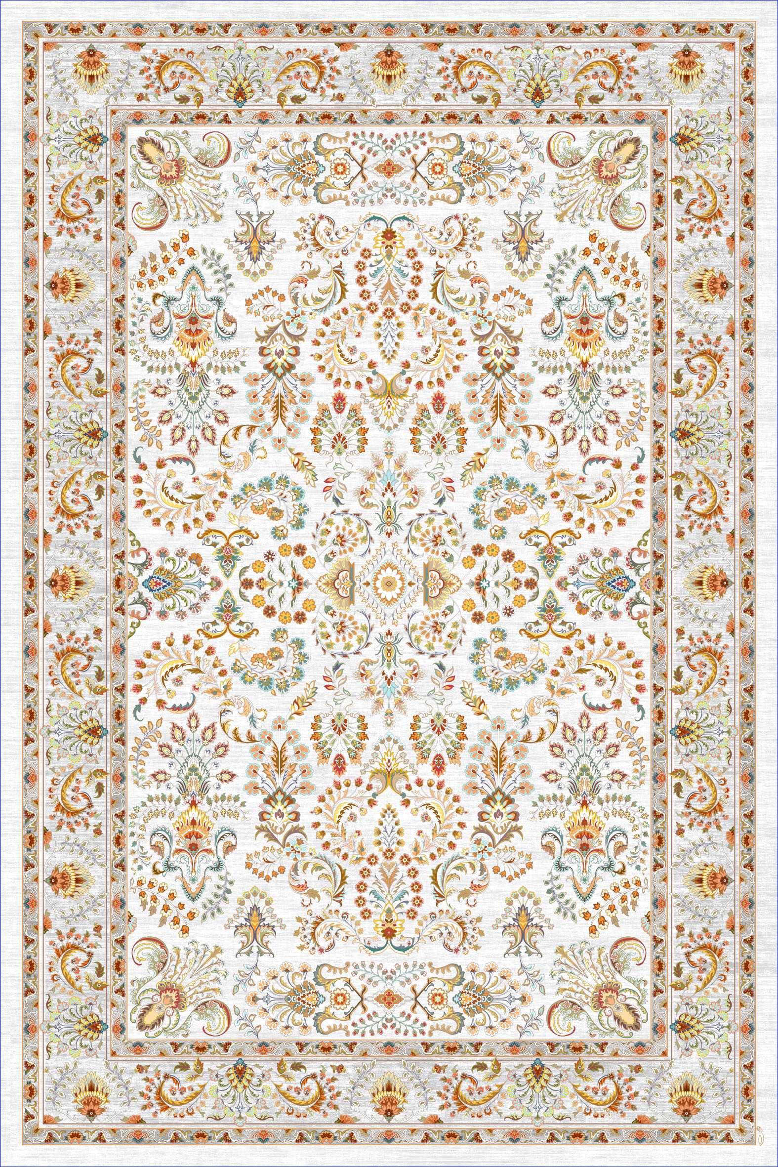 فرش کالتکس ۱۲۰۰ شانه طرح دلارا سفید حاشیه طوسی روشن