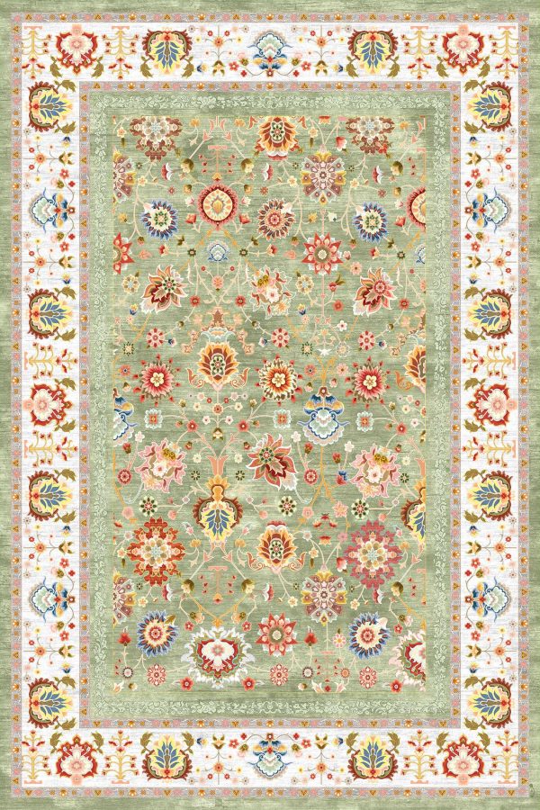 فرش کالتکس ۱۲۰۰ شانه طرح آورگل سبزحاشیه سفید
